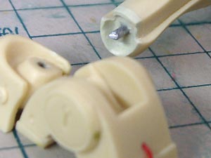 膝裏のパーツは溶けかかったようなモールドなので、削ってプラペーパーを貼っています。 肘関節もダルーなのでナイフやケガキノコ等でビシッと彫り直しています。 |