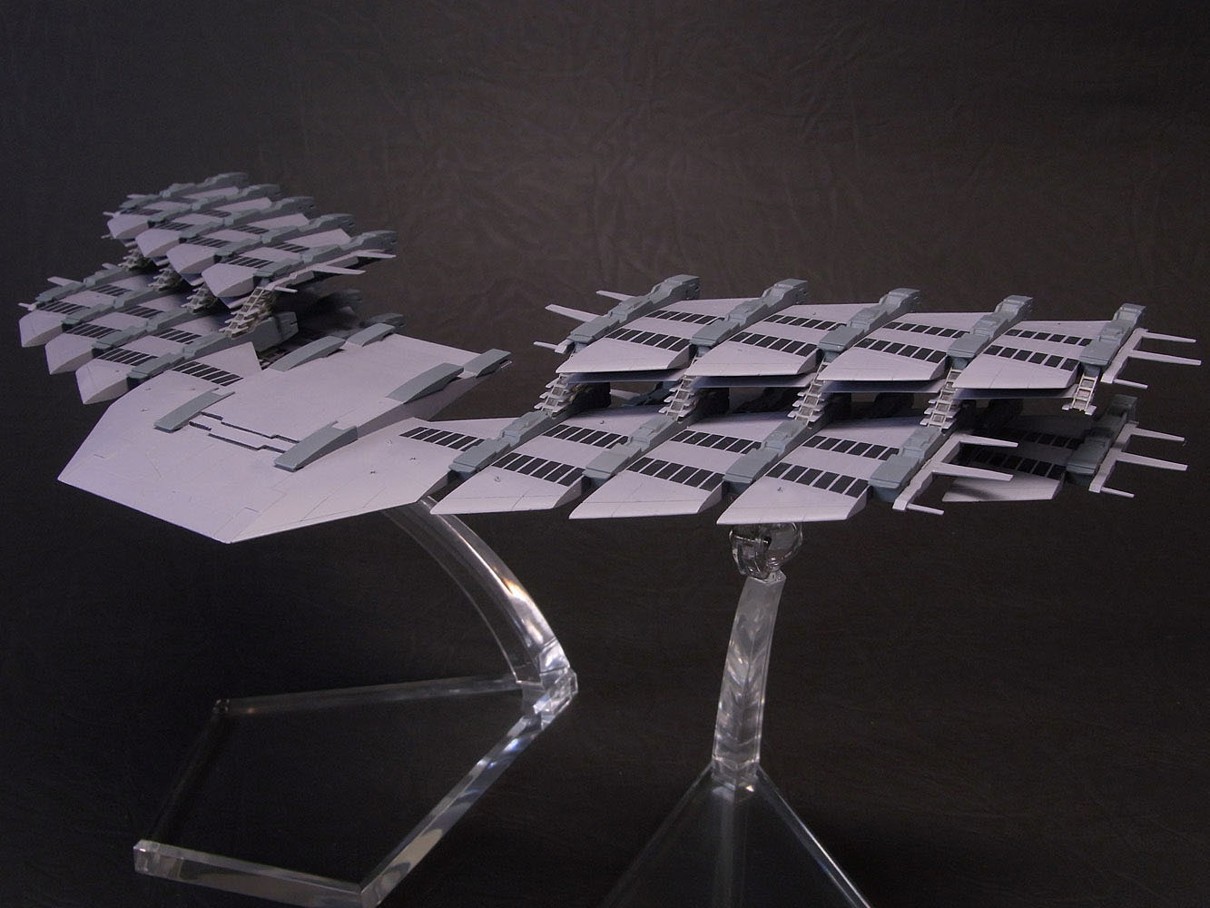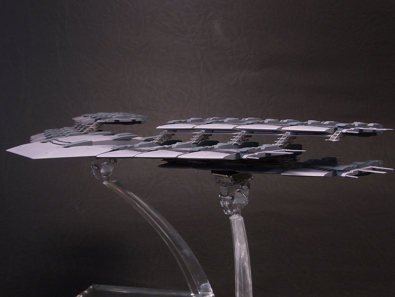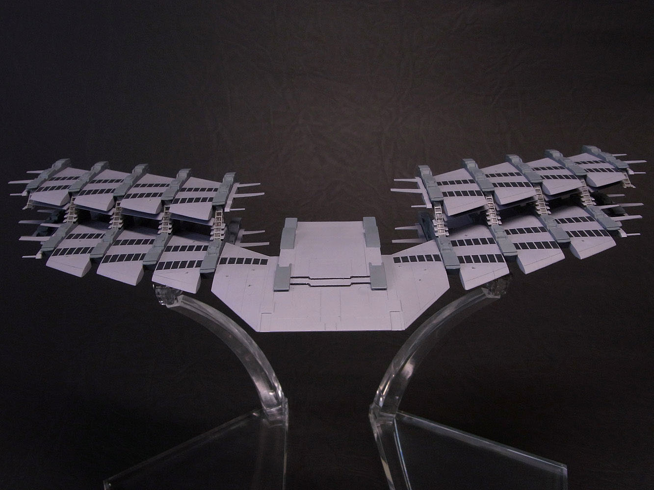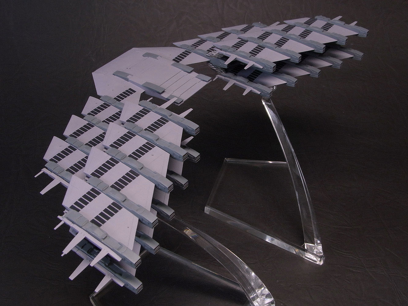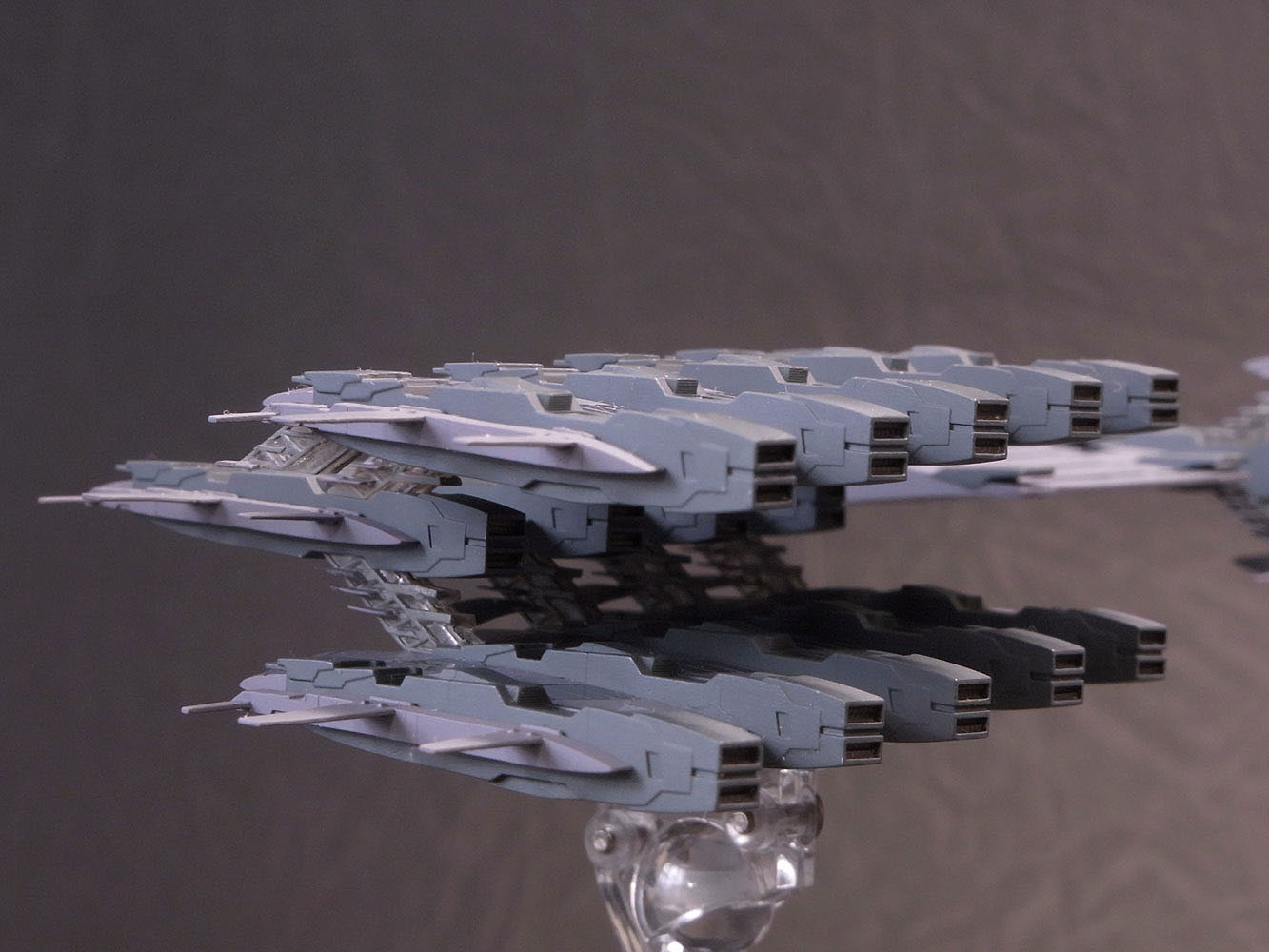 今回は1/17000という縮尺なのでスケール感をどう表現するのか悩みました。 いつものようにグラデーションや汚しはせずにベタ塗りでぺたーとした感じにしています。 本体色は彩度をぐっと落としたほとんどグレーな紫色です。窓の部分はあまり明るくすると変になっちゃったので、かなり黒よりのグレー。 窓っぽく見せるためにここだけ下地をピカピカに磨いてグレー塗装後にクリアーを上掛け。支柱部分は凸部分だけを慎重に筆塗りしています。