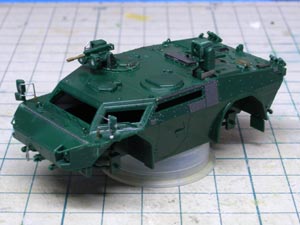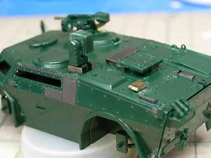 | 車体とシャーシを別に仕上げたので、継ぎ目が目立ってしまいました。 アンテナがよれちゃったのが残念無念。 あと右後方の赤丸テールランプが行方不明に。 |