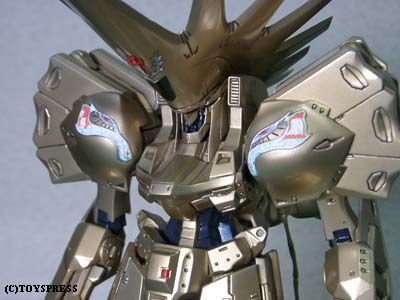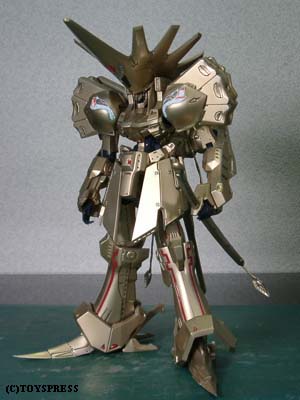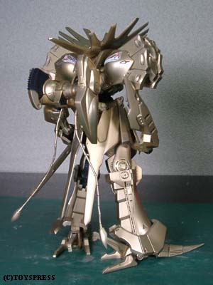 | ・右後方より 下地はサフ吹き後に1000番でペーパーがけ。 金塗装はシルバー下地にクリアイエロー+クリアオレンジというのが定番のようですがあまり好みではないため、シルバーをベースにゴールド+クリアイエロー+クリアオレンジで渋めの金を調色しました。 |