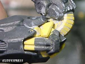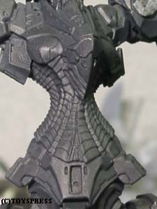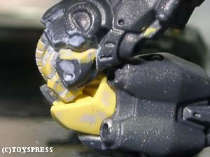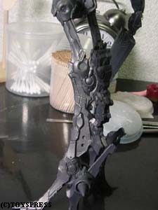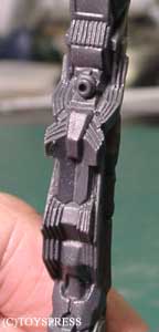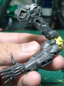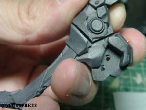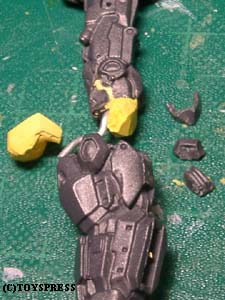 ・肘関節 ポリパテの盛り削りでとりあえずこんな感じに。 肘前下面のブロックが干渉してしまうため、 捻りこみながら傾いています。 それに伴い肘後面のブロックはせり出して…とかなんとなく考えてみました。 隙間の出来る部分はポリパテで適当に新造。 ‘動き’が見えれば成功なのですが。 |