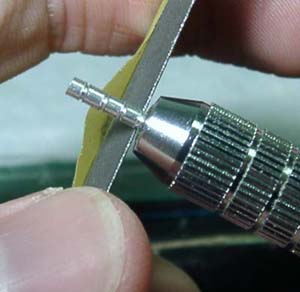 ・パイプ 肘関節を大きく曲げたのでキットの物は使えません。 とりあえず等間隔にアタリをとってフリーハンドで掘ってみる。 ならばー ピンバイスにくわえチャックの所に目立てヤスリを当てながらぎゅるりんぎゅるりん。 |