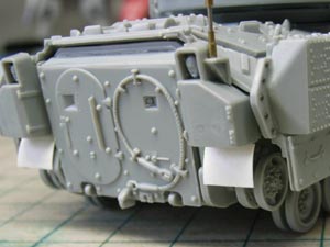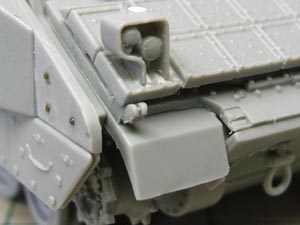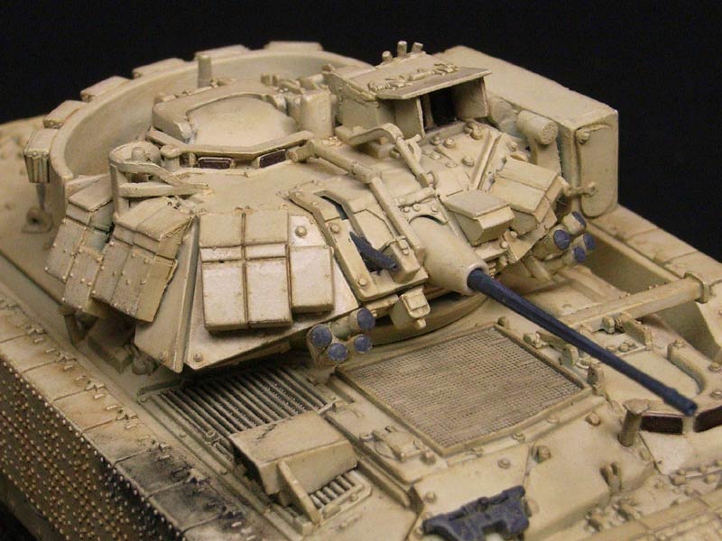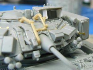 合いは良好ですので、パーツ数の割にはサクサク進みました。 基本的には素組みで部分的に薄く削ったりした程度です。 しかし後でERAを追加して発売されたキットのため、砲塔部分のERA取り付けに難あり。 実車同様ERA裏側にエッチング製の薄い三角板を貼り付けた上、ボルトで凹凸な追加装甲表面に貼り付けるのは少々手間がかかりました。 |
