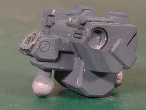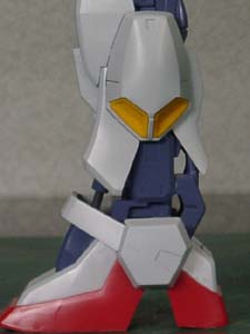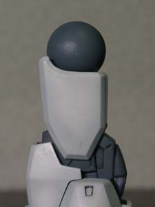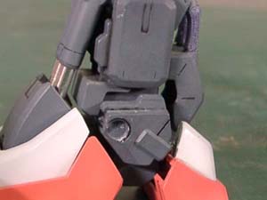 | 下腿部前面 下腿は細長く足部とのバランスを崩しています。 そこでインナーフレームの部分で1.5o短縮、 内側部分は下端で1o高くなるようにして楔状に幅増し、 外側部分は上端で2.5o低く、下端で1o高くなるように幅増ししました。 臑前面装甲は下部で3o短縮、左右幅を3oほど広げ、ポリパテで修正しました。 |