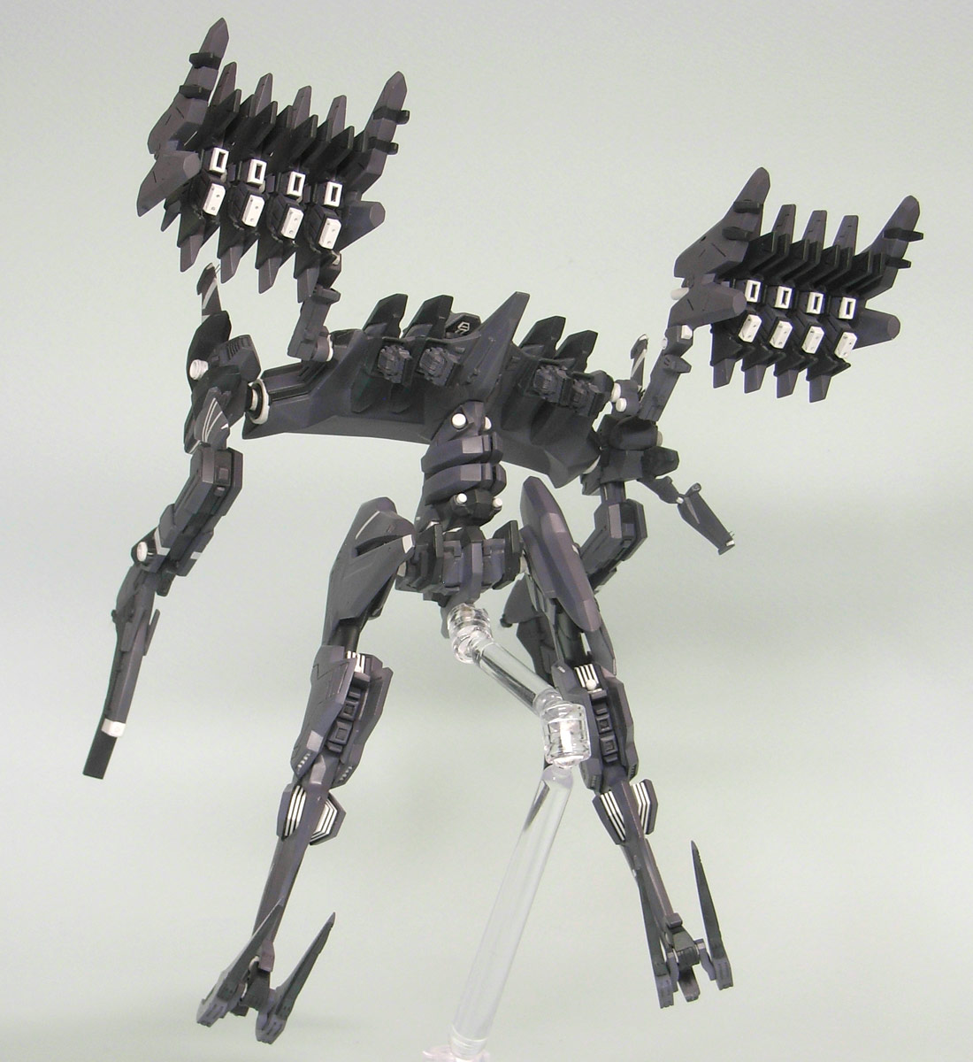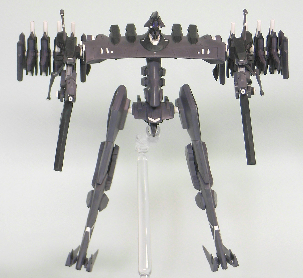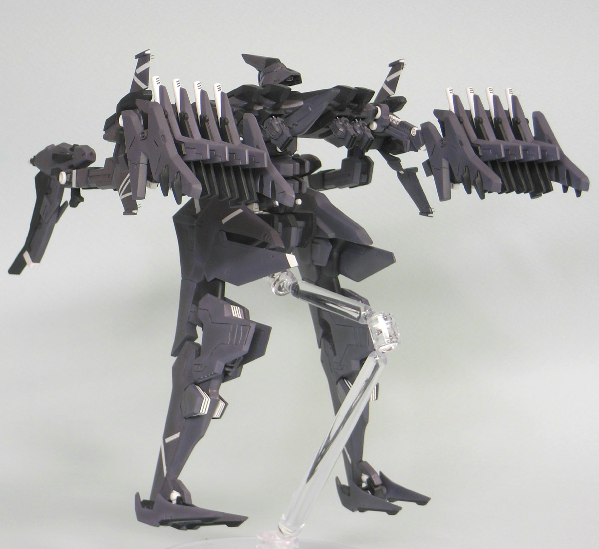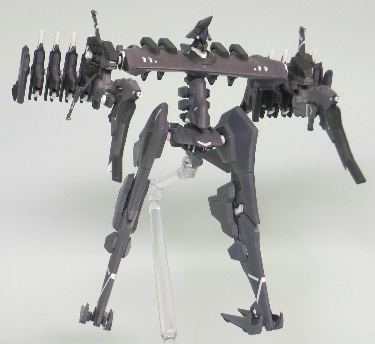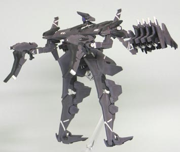 本体色は「アニメーションノートNo.9」に掲載されているカラー画を参考に適当に調色。 大腿部等面積の広い部分が多いので、ノッペリしないように軽くグラデーション。関節や整波装置の白が良いアクセントになりました。 各部の白いライン等はドローソフトで製作したものをMDプリンターでデカールを自作。1枚では透けてしまうので2枚重ねで貼りました。 ネクストは塗り分けが非常に細かい上にガレージキットなので、マスキングが必要な部分がかなり多くなっています。 ゲーム中より色数を少なくしていますが、それでも多く時間がかかってしましました。ACVIはコトブキヤの徹底した分割に相当助けられていたんだなあ。 今回下地のサフはガイアノーツの新製品「サーフェーサーエヴォ」を使ってみたのですが、吹き方が悪かったのか簡単にペリペリと剥がれまくって大変な目にあいました。 武装は今まで通りクレオスの「Mrレジンプライマーサーフェーサー」を使っていますが、こちらは爪で引っ掻いても剥がれないくらい強固でした。 ただ、ガイアより粒子が粗めなので軽く磨く必要があります。 紫:不明(彩度落としたグレー寄りの紫です。)黒:ネービーブルー 白:クールホワイト 紫・黒のグラデーションは下地に基本色を吹いたのち、エッジ等に白を混ぜた色を適当に吹き付け、最後に基本色で軽くオーバーコートしています。 オーバーコートすると深みが出るような気がして好きです。