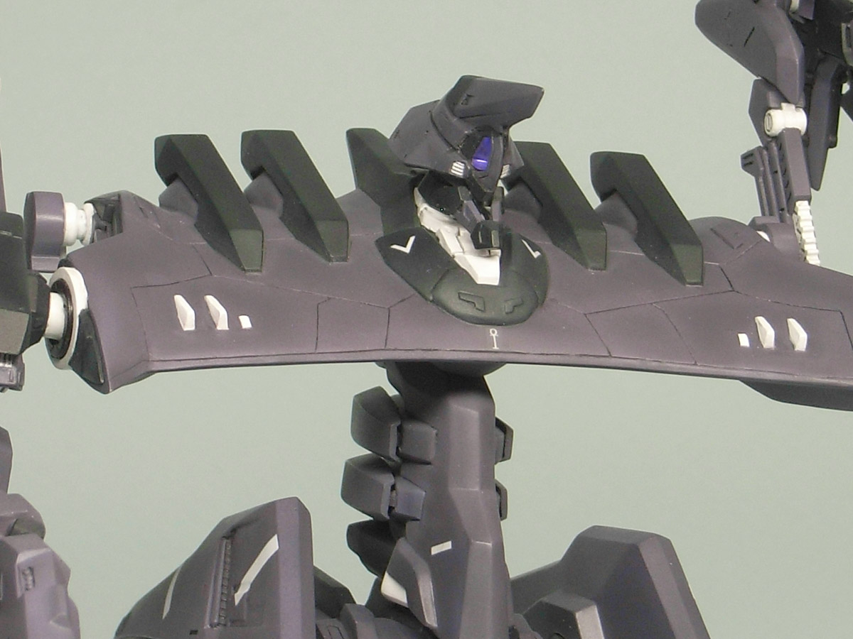 基本的にはストレートですが何箇所か気になった点を修正してみました。・腰を幅増し ・股間バックブースターを作り直し ・胸部前縁を延長・翼の前後縁を削り込み 前縁は分厚くても良い気もしますが、イメージ的に薄くて脆そうなので削ってみました。 ・翼端に放電索を追加 放電索はフロロカーボン製釣り糸0.7号(0.138mm)を使用。 細くても折れないのは良いのですが、2本を平行に揃えるのが難しかったです。 曲がると塗料は剥げるので、模型に使うのはちょっと微妙かも。 頭部カメラは無改造でハイキューパーツさんのLEDユニットを組み込んで発光させられる構造になっていましたが、持続時間が気になったのでクリアパーツの裏からメタルテープを貼るって光らせています。 関節部はACVI用のPCが付属しています。 ボールジョイントなどは無調節でもがっちり保持してくれるのが何気に凄い。量産時の収縮も見越して原型を作られたようです。