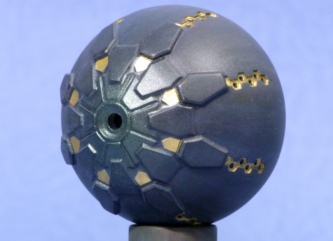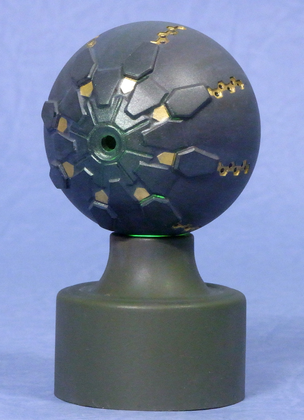 透明樹脂による出力で台座が光るようになっているので、サフは吹かず台座との接触面はマスキングして光が通るようにしておきました。 本体色は全面にウィノーブラック、上面中心に1番ホワイトでグラデーション。油絵の具を使ってコジマ粒子による汚れを表現。 金属感を出すために雲母堂本舗さんのMCブラック(CCパール)を全体に吹き付け。 最後に砲口周辺に同PCグリーンを吹いてコジマ粒子感を高めてみました。