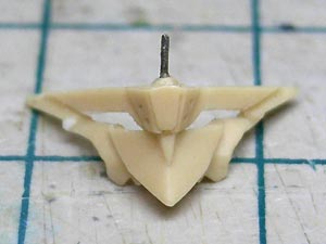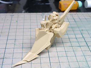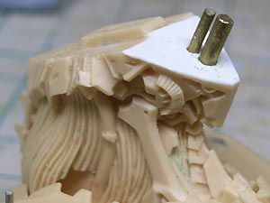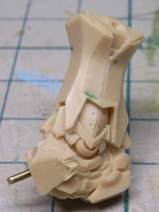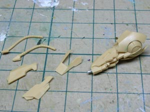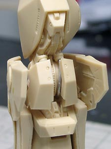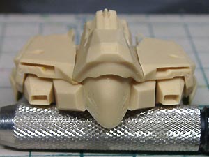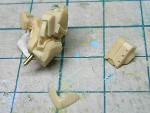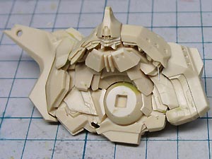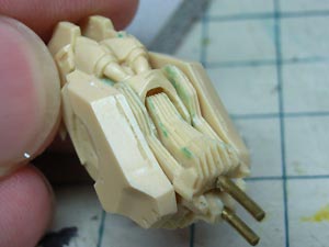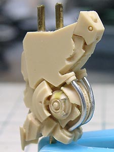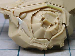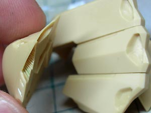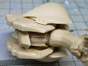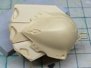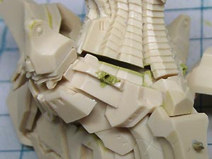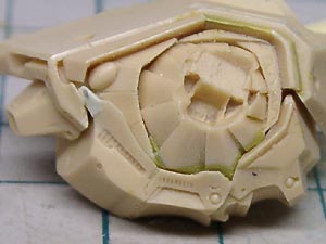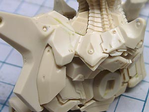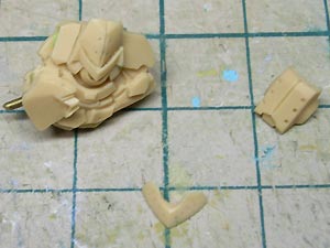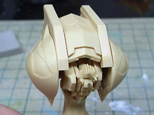 後頭部装甲は側頭部装甲とかなり干渉するため、隠れて見えない部分をごそっと削り落とし。 レジンキットとしては特に成形状態が悪いというわけではありませんが、パーツ割りが細かくクリアランスがシビアなため通常のキットよりパーツの合いが問題になってしまうようです。 |