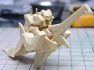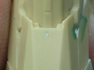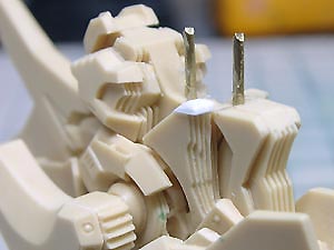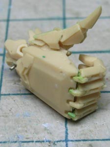 バスター砲発射時に下ろされるコンタクトは成形不良で端が欠けていたので、修正ついでに透明パーツ化してみました。 |