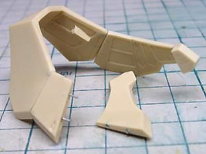 足裏に付く極薄パーツは板に貼り付いた状態で成形されています。 結局、周囲の板をニッパーで切り落として、裏側の余剰部分をナイフと鉄ヤスリでちまちちま削り落としました。 |
