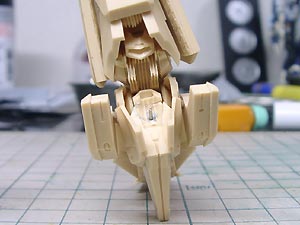 当初はフレームと頭部との接合面は前面、後面ともプラ板を張っていましたが、前面だけの方が良さそうなので、後面に貼っていたプラ板を剥がしました。 |