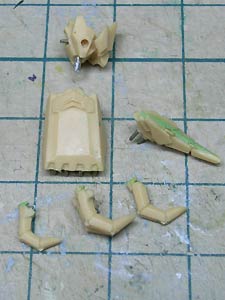 肘の三角プレートはブリーフバインダーと呼ぶそうで。 後側のプレートと接着してしまうとせっかく分割されている意味が無くなってしまうので、結局前腕アーマー側と金属線で固定しました。 こんな感じでこのキットは塗装前に接着すべきかどうか悩む部分が多いです。 |