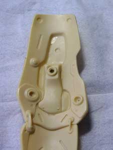 右肩に付く三節棍固定部はレジン製で隙間が埋まっているため、アルミ板で作り直しています。 |