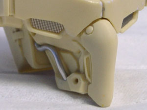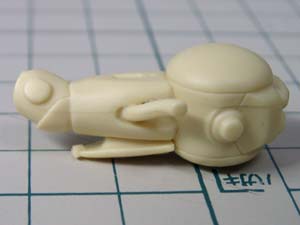 胸部の吸排気口が塞がってるため、いかにも‘レジンのムク’っぽい感じで気になります。 腹部側面のチューブは一体化しているため、削ってアルミ線で作り直しています。 |