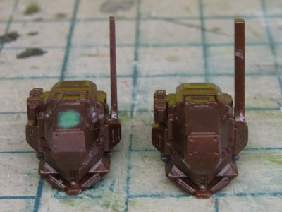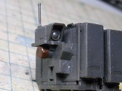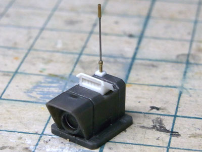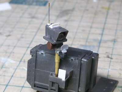 AC的には使用時にアチコチ展開しそうなので、天面にリトラクタブル式センサーも追加してみました。 スキャナーと言えばバーコードスキャナーだなーってことで横長です。 きっとこれで対象の装甲素材や強度をスキャンするんだろう。 カメラ後部のアンテナは0.3mmピアノ線と真鍮パイプで作り直しました。 カメラ自体に通信アンテナが付いていますが、リコンユニットと直接連動してスキャンする構造なんでしょうか。 |