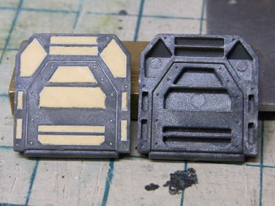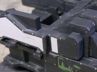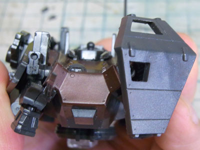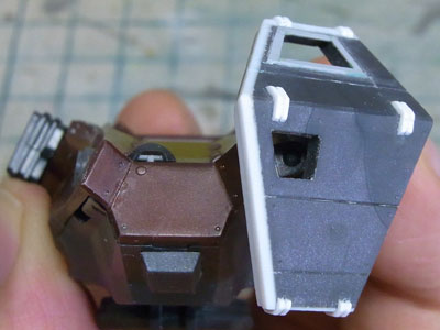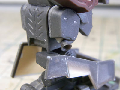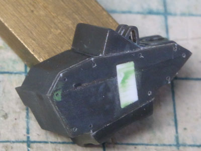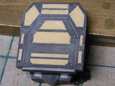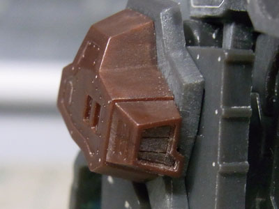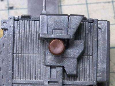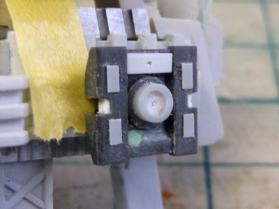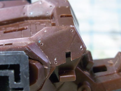 ショルダーユニット後面上部の四角い三つ穴は一旦削ってからプラ板に丸い三つ穴を開けたものを貼りつけました。 その他「線状」のモールドも埋めて0.4mmドリルでリベット様に修正しました。 |