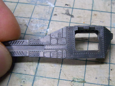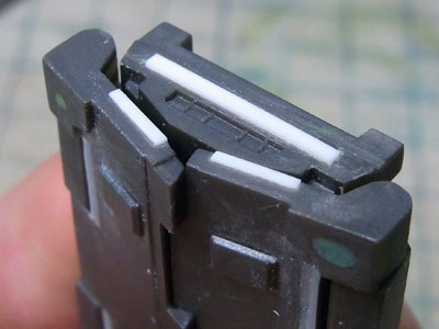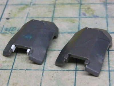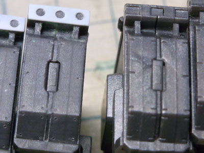 後部の継ぎ目消しはくぼんでいる部分なので少々面倒です。 付近のモールドは削り落して、プラ小片に紙やすりを貼りつけたもので削って継ぎ目を消しました。 モールドは一部のみプラ板で再生しました。 |