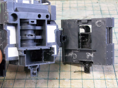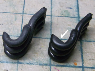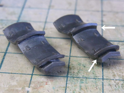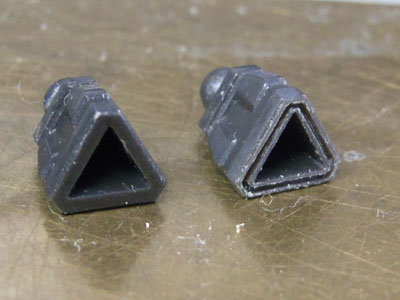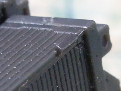 側面から上面に繋がる前後2本の溝ですが、上面は凹モールドですが側面は凸モールドとなっています。 これは意図的な感じもしますが、全体的にもっさりしてて平面を出す必要があるため、凸モールドは削って凹に変えました。 |