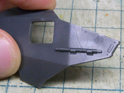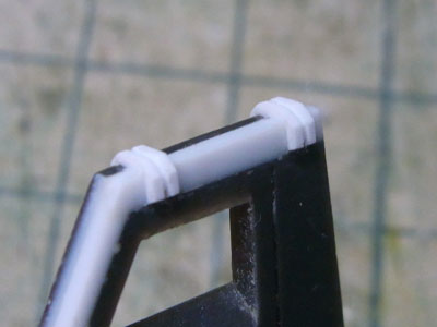 前面の厚さはそのままです。面取りはいらない気がするので、WAVEの1mmプラ三角棒を張り付けて直角にしました。初めて使いましたがこういう部分の修正には便利かも。 線状のモールドは埋めてリベット状に掘り直しです。 |