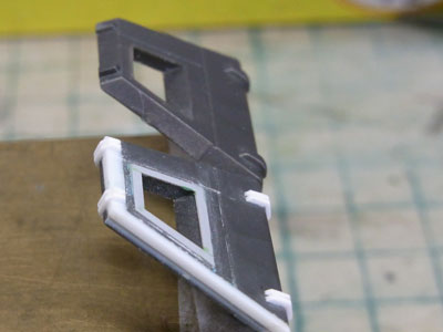 裏側の肉抜き部分はほとんど見え無さそうなので、下縁だけプラ角棒を貼りつけました。 …が、その後全体を薄く削ることにしたので結局エポキシパテで裏打ちしました。 |