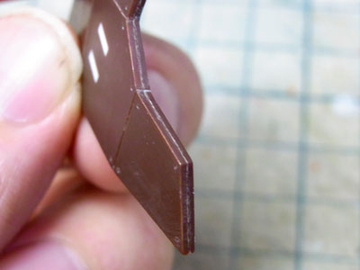 ・頭 分厚いアンテナが気になるので、半分くらいの厚みに削りました。 頭頂部に大きめなヒケがあるので、ラッカーパテで処理。 |