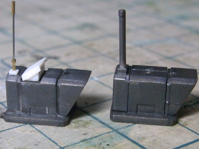 カメラ基部の膨らみ部分には小型レーダーが収まっている事にしてみました。 1/700現用艦艇のレーダーを角張らせてACっぽく。 その基部の部分も横長スキャナー搭載な感じにしてみました。 |