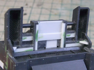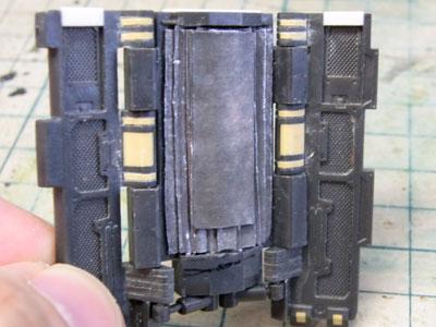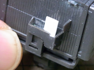 上部に肉抜きされている部分が露出しています。 なるべく重量増加は避けたいのですが、ここは目立ちそうなのでプラ板で塞いでいます。 |