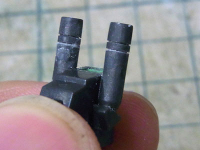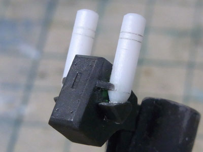 首元と胸部先端に付くセンサー的な何か。 左肩口の汚染計測器と同じようなものなのかな? 先端を2mmピアノ線に交換しました。 エッチングノコで切り込みを入れて、ナイフ・ライナーチズルで溝を掘って埋め込みました。 |