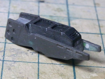 ・ジェネレータ上部装甲板 ジェネレータ上部に覆いかぶさっている装甲板です。整備時は前方にガバッと開くのだろうと考えると、前側に付いてる凸モールドはヒンジのハズ。 装甲板にめり込んでいる部分はカットして、プラ板を内面・上面に継ぎ足ししました。 |