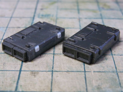 ・ブースターブロック ジェネレータ横のブロックです。側面から装甲板を貼っているんだろう、ということでスジボリを追加しています。表面の窪みは良く分らないのでプラ板で埋めました。 上部の突起物はつり上げ用のリングのようなのでピンバイスで開口して、ナイフと針ヤスリで整えました。 |