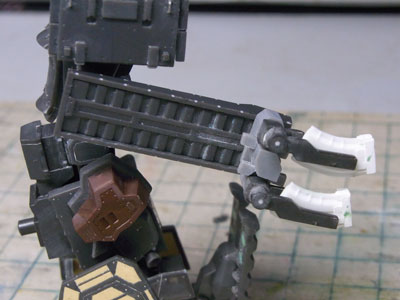 マウント部分は肩ハンガー用の部品を加工してマガジンを挟めるようにしました。きっとミグラントお手製の改造品なんだろう。 マガジン2個のために大仰な感じですが、まあデッドウェイトよりはいいか。 これでマガジンリロードの再現だ!と思ったら、ACVではリロードが無いという…。 |