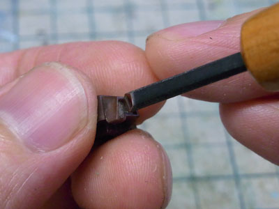 少し奥まった部分なのでガイドテープが使えず、フリーハンドで掘ってスジボリが曲がってしまうと修正に手間がかかりそうです。 そこで丁度良い大きさの平刀を押しつけてアタリを入れてからライナーチズルで掘りました。 |