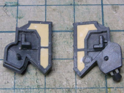 ・脛左右ブロック 裏側が肉抜きされています。ほとんど目立たない部分ですが、大した手間もかからないのでエポキシパテで埋めました。 |