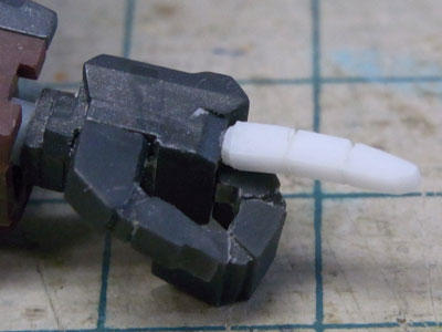 ・左手 UAM-10Aの指は中指から小指が一体化された3本指です。 キットでもそんな感じですがモールドが甘いので他の指と分離することにしました。 左人差し指は伸ばした状態にしたいので、2mmプラ角棒を削って新造です。 親指は付け根を1mmアルミ線で接続して少し斜めに取り付けました。 |