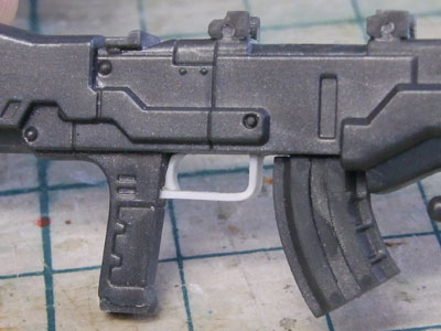 ・URF-15 VALDOSTA トリガーガードとトリガーが省略されているのでプラ板で追加。 トリガーガードはプラが軟らかめなエバーグリーンのプラ板を曲げて作りました。 |