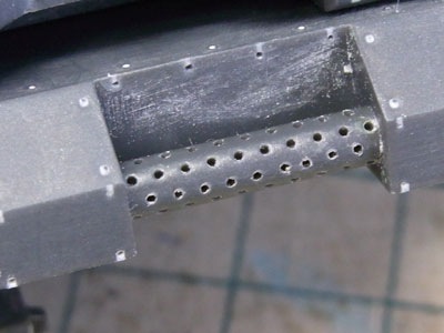 ・ジェネレータ 胴体後部のジェネレータ下部はリベットが線状になっているので埋めました。 また、合わせ目に一部隙間ができるのでメッシュ部分を埋めないように丁寧に修正します。 |