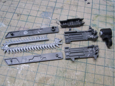 6本あるチェーンソー部分は塗装後に組めるように刃の一部を切り欠きました。 そしてひたすら軽量化。 |