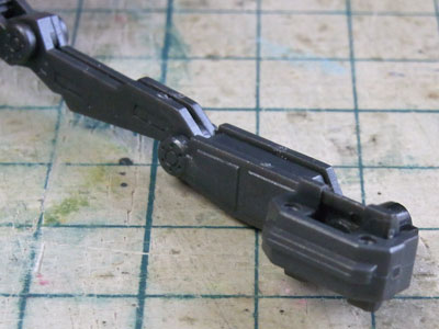 ・サブアーム OW使用時はサブアーム先端に右手武器を接続するようになっています。 で、気になるのがこの武器との接続部分。 キットでは板状の部品に付いたコの字型の部分に銃のグリップを通して固定する形になっていますが、ゲーム上では板状の部分のみでグリップと接続されています。 一体どんなメカニズムだ? |