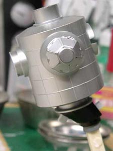 銀色の成形色のパーツは何故か塗料のノリが悪く、Mrカラーもサフもペリペリ剥がれるので まずメタルプライマーを吹きつけ。 外壁はアルクラッドIIのホワイトアルミニウムで塗装しています。 |