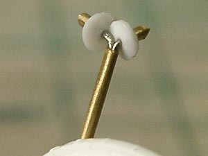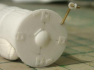 後方のアンテナが省略されているため、プラ板・金属線等でちまちま新造。 形状はよく分からないため適当に。 前方のアンテナも省略されていますが、接続状態では折りたたまれて目立たないため、省略しました。 |
