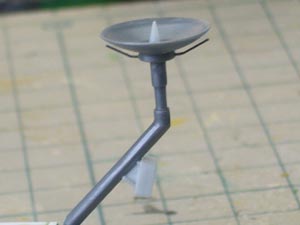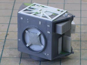 まずKuバンドアンテナですが、本体側面に付くようになっているので、 天頂面に付くよう付け根を90°回転させます。 一体整形のため皿の凹面が真っ平らなのでリューターと曲刃ナイフで彫り直し。 あとは小さなアンテナや送受信器を追加しました。 |